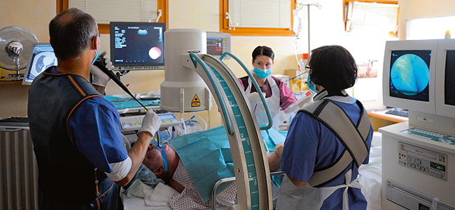 Prof. Dr. Thomas J. Vogl, Jan-Erik Scholtz, Stephan Zangos, Gösta Lotz, Jörg Trojan, Sylvie Paetzold, Institut für Diagnostische und Interventionelle Radiologie, Klinikum der Johann Wolfgang Goethe-Universität Frankfurt Die Chemosaturation ist ein Verfahren zur isolierten Chemotherapiebehandlung der Leber. Dies wird durch das Einbringen mehrerer Schläuche, so genannter Katheter, in die Gefäße des Körpers möglich, über die dann das Chemotherapeutikum gezielt dem isolierten Organ zugeführt werden kann. Das Verfahren zählt zu den minimalinvasiven Therapieoptionen und ist mehrfach anwendbar. Durch das Filtrieren des venösen hepatischen Blutes, d.h. das Blut, das die Leber verlässt, ist eine hochdosierte intrahepatische Chemotherapeutika-Gabe möglich. Das System wird unter dem Namen Hepatic CHEMOSAT ® Delivery System von der Firma Delcath Systems Inc., New York vertrieben. Es ergänzt die bisherigen interventionell-onkologischen Maßnahmen. Am Klinikum der Johann Wolfgang Goethe-Universität in Frankfurt wurde dieses Verfahren erfolgreich erstmalig in Deutschland und Nordeuropa eingesetzt. Nach gründlicher Voruntersuchung des Patienten und anschließender Evaluation der Therapiemöglichkeiten durch das Leberzentrum und das Universitäre Centrum für Tumorerkrankungen der Universitätsklinik Frankfurt, wird die Chemosaturations-Therapie am Institut für diagnostische und interventionelle Radiologie unter Leitung von Prof. Dr. Vogl durchgeführt. „An der Umsetzung waren vor allem die Kollegen aus Anästhesie, Kardiologie, Gastroenterologie und Radiologie beteiligt, aber auch noch einige weitere Fachgebiete. Ohne die hervorragende Zusammenarbeit aller Beteiligten, der Pflegekräfte, des medizinisch-technischen Personals sowie der Ärztinnen und Ärzte, hätten wir das Verfahren nicht so erfolgreich anwenden können“, sagt Prof. Vogl. Die Leber als Zielorgan für eine regionale Chemotherapie eignet sich besonders aufgrund des Auftretens mehrerer Tumorabsiedlungen innerhalb des Organs, der komplexen Struktur sowie des Wachstums des Tumors. Außerdem kann damit einer möglichen Funktionseinschränkung der Leber durch die Erkrankung teilweise entgegengewirkt werden. Das Grundprinzip der regional intraarteriellen Chemotherapie bei primären und sekundären Lebertumoren basiert auf der dualen Blutversorgung der Leber. Hepatozyten, die Zellen der Leber, werden vor allem über die Portalvene versorgt, die nährstoffreiches Blut aus dem Magen-Darm-Trakt führt. Die Tumore der Leber hingegen werden fast exklusiv vom arteriellen hepatischen Blut versorgt; dies ist sauerstoffreich, aber nährstoffarm. Bei isolierter Gabe über die Arterien der Leber wird somit eine relative Schonung des Lebergewebes und die isolierte Behandlung der Lebertumore ermöglicht. Um eine regionale Chemotherapie der Leber zu erreichen, ist das Einbringen mehrerer Katheter nötig: Der erste Katheter wird über die Femoralarterie in die hepatischen Arterien gelegt. Dieser ermöglicht die gezielte Zuführung des Chemotherapeutikums in die Leberarterien.