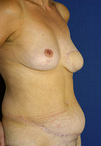 Abb.2 DIEP-Flap rechts mit weitgehendem Ersatz des Hautmantels und Mamillenrekonstruktion durch Hauttransplantation und lokale Lappenplastik Der Wiederaufbau einer Brust mit körpereigenem Gewebe hat viele Vorteile. In erster Linie zählt die geringere Komplikationsquote, im Verlauf aber auch die ästhetische Ergebnisqualität. Sowohl in Aussehen als auch von der Qualität des Tastgefühls ist der Wiederaufbau aus Eigengewebe einem Implantataufbau weit überlegen. Das Gewebe altert synchron zum Organismus der Patientin. Die Betroffenen leben somit ohne Fremdmaterial und ein Wechsel erübrigt sich. Nur selten wird eine spätere ästhetische Verbesserung notwendig. Bei Patientinnen mit großen Weichteildefekten, Hautschäden nach Strahlentherapie oder bei Narbenkontrakturen stellt sie ohnehin meist die einzig sinnvolle Alternative dar. Dennoch – es gibt auch Nachteile. Als Hauptnachteil ist ein zusätzlicher Eingriff an einer bisher nicht betroffenen Körperstelle zu erwähnen. Auch wenn viele Frauen die Gewebeentfernung z.B. am Abdomen als angenehmen Vorteil empfinden, handelt es sich doch um einen rekonstruktiven Eingriff, und nicht immer kann ein Resultat wie nach ästhetischer Hautstraffung erzielt werden. In spezialisierten Zentren sind diese Eingriffe jedoch längst Routine. Die modernen Techniken erfordern ein umfangreiches mikrochirurgisches Training und große Erfahrung in diesem speziellen Bereich, die nicht an allen Krankenhäusern vorhanden ist. Gut etablierte Brustzentren haben in diesen Fällen eine feste Kooperation mit einem erfahrenen Plastischen Chirurgen. Mikrochirurgische Techniken – weitere Beispiele Nicht bei allen Frauen eignet sich der Unterbauch als Spendeareal. Nach ausgedehnten abdominalen Voroperationen oder bei sehr schlanken Patientinnen kann es mitunter vorteilhafter sein, auf andere Körperregionen auszuweichen. TMG-Lappenplastik Der TMG-Flap „Transverse Myokutane Gracilis“ stellt eine gute Alternative dar. Verwendet wird Gewebe von der medialen Oberschenkelregion, wie etwa bei einer ästhetischen Oberschenkelstraffung. Geeignete Frauen benötigen wenig Haut zur Rekonstruktion und weisen ein kleines bis mittelgroßes Volumen an der kontralateralen Brust auf. Die Vorteile dieser gefäßgestielten Lappenplastik: große Verlässlichkeit und einfache operative Technik. Daher hat sie auch heute noch in schwierigen Fällen oder als Salvage-Procedure sinnvolle Einsatzgebiete. Die Nachteile sind: eine zusätzliche Narbe und ein „geopferter“ Muskel, der aber zu wenig Volumen hat, um auf das Implantat zu verzichten. Hinzu kommen Defizite für eine gute Symmetrie und die hohe Rate an Kapselfibrosen. Die Weiterentwicklung dieses Prinzips war nur eine Frage der Zeit. Aufgrund der guten Erfahrungen mit der geringen langfristigen Komplikationsquote des Eigengewebes suchte man Gewebe mit einem Durchblutungsstiel, der bis zur Brust reichte und ausreichend Volumen besaß, um auf das Silikonimplantat zu verzichten. Am Unterbauch fand sich adäquates Gewebe. Der TRAM-Flap verwendet das Haut-Fettareal des Unterbauches ähnlich wie bei einer Bauchdeckenstraffung. Die Gefäßversorgung erfolgt über den Gefäßstamm des vorderen Bauchmuskels. An dem Muskel gestielt, erfolgt die Verlagerung an die Brust. Der Hebedefekt wird durch eine Bauchdeckenstraffung verschlossen. Diese Technik stellte eine enorme Verbesserung der bisherigen Möglichkeiten dar. Es war hiermit möglich, ausschließlich durch körpereigenes Gewebe eine symmetrische Brust mit sehr gutem Tastgefühl zu formen. Zwar wird ein Teil des hier verlaufenden Gracilismuskels verwendet. Er ist jedoch der kleinste Muskel an dieser Stelle und seine Funktion wird durch die verbleibenden kräftigen Oberschenkelmuskeln kompensiert. Der Narbenverlauf ist dezent, die Operationszeit kurz und Einheilungsstörungen selten. Steht auch am Oberschenkel zu wenig Volumen zur Verfügung, oder ist ein größeres Hautareal für die symmetrische Wiederherstellung erforderlich, ist die Gesäßregion eine weitere Option.
