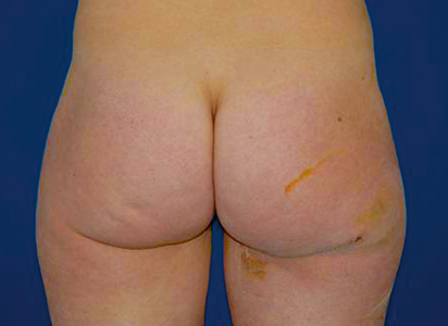 Abb. 4 Unauffälliger Hebedefekt/Narbe nach FCI-Flap am rechten Gesäß direkt postoperativ. Die Symmetrie ist kaum gestört. Als Nachteil muss bei den Plastiken der Glutealfalte häufig ein Gefühlsnerv durchtrennt werden. Manchmal verbleibt ein Taubheitsgefühl am hinteren Oberschenkel. Beim S-GAP tritt dies nicht auf. Dafür ist die Narbe etwas unvorteilhafter positioniert. Wiederaufbau der Mamille Für die Rekonstruktion der Brustwarze gibt es viele Möglichkeiten. Es handelt sich um einen kleineren Eingriff, der in der Regel in Kombination durchgeführt wird. Eigenfett-Transplantation zur Form- und Volumenkorrektur Die Eigenfett-Transplantation (sog. lipofilling) ist ein relativ neues Verfahren, das zunehmend bekannt wird. Fettzellen werden durch Absaugung, also ohne Gefäßversorgung, gewonnen und nach Aufarbeitung in die Brust implantiert. Es handelt sich um einen losen Zellverbund. Nur die Zellen, die rechtzeitig Anschluss an die örtlichen Gefäße finden, können überleben. Das Verfahren ist sehr gut geeignet, um kleinere Form- und Volumenasymmetrien während eines wenig invasiven Eingriffes auszugleichen. In den letzten Jahren hat die Eigenfett-Transplantation Kontroversen hinsichtlich ihres Potentials zur Tumorinduktion ausgelöst. Hintergrund ist, dass mit den Adipozyten auch Stammzellen transplantiert werden. Sowohl ihr Verhalten als auch der fördernde Einfluss des Transplantates auf die Angiogenese sind insbesondere bei potentiell residualen Tumorzellen noch nicht abschließend geklärt. Auch wenn klinische Beobachtungen diesen in-vitro-Effekt bisher nicht bestätigen konnten, so sind Langzeitergebnisse der Eigenfett-Transplantation bei diesem Patientenklientel noch nicht ausreichend verfügbar. Daher praktizieren wir das Lipofilling nur bei Patientinnen, bei denen das Brustdrüsengewebe vollständig entfernt wurde. Nach brusterhaltender Therapie stehen wir der Eigenfett-Transplantation bislang zurückhaltend gegenüber. Ein vollständiger Aufbau der Brust als Ersatz für einen mikrochirurgischen Eingriff ist bisher nur in wenigen Fällen publiziert. Aus unserer Sicht bleibt diese Technik derzeit günstigen Einzelfällen vorbehalten, bei denen ausreichend Haut an der Brust zur Verfügung steht und nur ein geringes Volumen erzielt werden muss, bzw. sehr viel überschüssiges Fettgewebe an anderer Körperstelle vorhanden ist. Nach eigenen Erfahrungen sind zahlreiche Eingriffe erforderlich. Sehr gut eignet sich das Verfahren hingegen bei der Optimierung mikrochirurgischer Lappenplastiken und auch zur Verbesserung von Implantatrekonstruktionen. Fazit Die Zusammenarbeit hochspezialisierter Fachgebiete hat die bisher erzielten Erfolge bei der Behandlung onkologischer Erkrankungen ermöglicht. Auch beim Mammakarzinom ist die Versorgung aus nur einer Hand nicht mehr in der erforderlichen Qualität zu gewährleisten. Die Zusammenarbeit besonders der onkologischen Disziplinen ist in Deutschland fast überall sehr gut etabliert. Dieser Anspruch gilt ebenfalls für die Brustwiederherstellung. Die Vielzahl der zur Verfügung stehenden Techniken auch in komplexen Situationen zu beherrschen, erfordert ein langjähriges spezielles Training. Um ein möglichst gut auf die individuelle Patientin abgestimmtes Rekonstruktionsverfahren anbieten zu können, ist es erforderlich, sämtliche, auch die modernen mikrochirurgischen Techniken, zu beherrschen. Nur so ist sichergestellt, dass die Entscheidung nicht aufgrund technischer Limitationen eingeschränkt ist. Alle Frauen sollten sich bereits bei der Diagnosestellung des Brustkrebses über sämtliche Rekonstruktionsoptionen informieren – dies unterstützt die psychologische Krankheitsbewältigung und schafft einen Planungshorizont für die Form der Mastektomie und den Zeitpunkt der Rekonstruktion. Entscheidend ist der Wunsch der Patientin. Die Krankenkassen übernehmen sämtliche Kosten der oben beschriebenen Verfahren des Brustwiederaufbaus nach einer Mammakarzinomerkrankung. Eine Rekonstruktion mit Expander und Silikonimplantaten kann häufig eine akzeptable Brustform erzielen. Falls ein zusätzlicher Weichteilschutz erforderlich ist, stellt die Latissimus dorsi Lappenplastik nach wie vor eine Option dar. Im Hinblick auf die Nachhaltigkeit des Operationserfolges sowie auf das ästhetische Endergebnis, halten wir die autologe Mammarekonstruktion mit freien, mikrochirurgisch transplantierten Lappenplastiken für die derzeit beste Methode. Zwar ist der perioperative Aufwand umfangreicher und die anfänglichen möglichen Komplikationen hierdurch stärker als bei alloplastischen Rekonstruktionen. In der Obhut einer zertifizierten Klinik zur Brustrekonstruktion ist die Komplikationsrate allerdings gering und bei planmäßigem Verlauf stellt diese Brustrekonstruktion ein endgültiges, lebenslanges Resultat dar. Eigenfett-Transplantationen sind derzeit eher ein additives Verfahren und hinsichtlich ihrer onkologischen Sicherheit noch nicht abschließend zu bewerten. (Literaturquellen bei der Redaktion) Weitere Informationen: