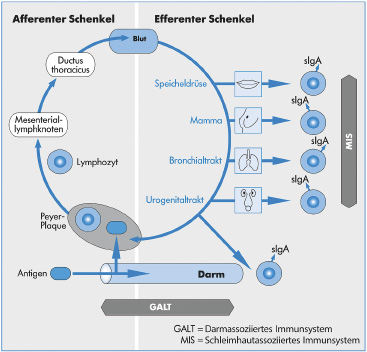 Abb. 4 Im Darm aktivierte Lymphozyten wandern durch den Körper und sorgen auf allen Schleimhäuten durch sekretorische Antikörper für Infektabwehr (Homing) Darmflora bei Krebs verändert Eine intakte Darmflora und ein intaktes Immunsystem gehen deshalb Hand in Hand. Änderungen der Mikroflora können Folgen für die körpereigene Abwehr haben. Auch bei Patienten mit Darmkrebs zeigt die Zusammensetzung der Darmflora deutliche Abweichungen. Dabei scheint die Verschiebung nicht nur die Folge der Krebsentstehung zu sein. Wie eine aktuelle Studie an Mäusen zeigt, kann die Zusammensetzung der Darmflora das Krebsrisiko direkt beeinflussen. Antibiotika und andere Medikamente, Stress und Krankheitserreger sind Beispiele für Einflüsse, die die Zusammensetzung der Darmflora verändern und das produktive Gleichgewicht stören können. Die Wissenschaftler übertrugen die Darmbakterien einer an Darmkrebs erkrankten Maus auf Tiere, die keimfrei aufgewachsen waren und keine eigene Darmflora entwickeln konnten. Die neu besiedelten Mäuse litten daraufhin doppelt so häufig an einem Darmtumor wie Mäuse, die mit den Darmbakterien gesunder Mäuse gefüttert worden waren. Die Darmflora der an Krebs erkrankten Mäuse hatte eine erhöhte Anzahl an Bacteroides, Odoribacter und Akkermansia-Bakterienarten, während die Bakterienfamilien der Prevotellaceae und Porphyromonadaceae verringert waren. Inwieweit der bei Mäusen beobachtete Einfluss auf das Darmkrebsrisiko auch beim Menschen zutrifft, muss jedoch erst noch untersucht werden. Die Macht der Darmflora nutzen Seit fast 60 Jahren steuert die Mikrobiologische Therapie einer ungünstig veränderten Darmflora mit bakterienhaltigen Präparaten entgegen. Das Ziel ist es, das Immunsystem in der Darmschleimhaut dauerhaft zu stabilisieren und damit die Immunität als Ganzes zu stärken. Die Therapieform ist nebenwirkungsarm und auch zur Behandlung von Kindern geeignet. Der Patient nimmt dabei Präparationen mit lebenden oder abgetöteten Bakterien zu sich. In der Regel gehören die enthaltenen Bakterien zur natürlichen Darmflora: nicht krankheitserregende E.-coli-Stämme, Enterokokken, Laktobazillen und Bifidobakterien. Sie wirken nachhaltig auf das Immunsystem, indem sie unter anderem die Bildung von sIgA an den Schleimhäuten anregen oder eine gestörte Immunbalance wiederherstellen. Ein zweites Element der Mikrobiologischen Therapie sind die Autovakzinen – Individualarzneimittel aus inaktivierten, körpereigenen Bakterien oder Pilzen des Patienten. Je nach Krankheitsbild können unspezifische oder erregerspezifische Autovakzinen eingesetzt werden. Die unspezifischen Autovakzinen enthalten nicht krankheitserregende E.-coli-Stämme aus der patienteneigenen Darmflora. Um die spezifischen Autovakzinen herzustellen, wird dagegen ein Krankheitserreger direkt aus dem Infektionsherd isoliert und inaktiviert. Die Mikrobiologische Therapie nutzt die Macht der Darmflora über unsere Gesundheit. Die derzeit stattfindenden, intensiven Forschungen in aller Welt zur Bedeutung der Darmflora in Gesundheit und Krankheit werden die Möglichkeiten dieser sanften Therapieform noch deutlich erweitern. Erhalt einer gesunden Darmflora – insbesondere unter Antibiotikatherapie! Die Verordnung von Antibiotika gehört heute nahezu zur Tagesordnung in der ärztlichen Praxis. Dies hat fatale Folgen für die Darmflora, denn sie ist sehr anfällig für Störungen. Insbesondere Antibiotika können zu dauerhaften Schäden dieser empfindlichen Gemeinschaft führen. So gibt es Untersuchungen, die zeigen, dass noch ein halbes Jahr nach der letzten Gabe eines Antibiotikums die bakterielle Besiedelung des Darms gestört ist – mit weitreichenden Folgen für unsere Gesundheit. Daher ist es wichtig, bei Einnahme eines Antibiotikums die Mikroflora des Darms zu schützen. Dies ist durch die gleichzeitige Gabe milchsäurebildender Bakterien, insbesondere Laktobazillen möglich. Diese Schutzbakterien unterstützen zudem den Erhalt des sauren Darmmilieus und sorgen mit dafür, dass potenziell schädliche Keime nicht die Überhand gewinnen und uns krank machen können. Wie wirksam diese ergänzende Einnahme von Milchsäurebildnern im Rahmen einer Antibiotikatherapie ist, konnten inzwischen zahlreiche Studien zeigen. Unter anderem wurde nachgewiesen, dass das Risiko einer durch Antibiotika verursachten Diarrhoe um über 50 Prozent bei gleichzeitiger Gabe von Milchsäurebildnern gesenkt werden konnte. Zudem war bei den Patienten, die dennoch Durchfall bekamen, das Risiko einer schweren (unter Umständen lebensbedrohlichen) Verlaufsform ebenfalls um knapp 50 Prozent reduziert. Die Gabe der Milchsäurebakterien sollte dabei bereits mit dem ersten Tag der Antibiotikatherapie begonnen und mindestens über drei bis vier Wochen täglich nach deren Beendigung weitergeführt werden. Dies gilt nicht nur für Erwachsene, sondern insbesondere auch für Kinder und dies bereits ab dem Säuglingsalter. Dabei sollte weniger auf probiotische Milchprodukte zurückgegriffen werden, da bei etlichen Antibiotikagruppen die gleichzeitige Gabe von Milchprodukten zu vermeiden ist. Vielmehr angebracht sind spezielle Präparationen, die ausschließlich die Schutzbakterien enthalten. Solche Zubereitungen sind im Bereich der Nahrungsergänzungsmittel angesiedelt. Mit diesen Präparaten nimmt man überdies in der Regel auch eine deutlich höhere Zahl dieser Schutzbakterien zu sich, was deren protektive Wirkung auf die Darmflora verbessert. Weitere Informationen: Hier noch ein Hinweis der Redaktion: Unsere Autoren sind bemüht, ihre Artikel für alle Leserinnen und Leser, verständlich zu verfassen. Sollten Ihnen einzelne Begriffe in den Texten unverständlich sein, hier finden Sie Hilfe: „Die blauen Ratgeber“ – Krebswörterbuch der Deutschen Krebshilfe e.V. entweder über www.krebshilfe.de oder Telefon 0228 – 729 90-0 und natürlich auch über www.wikipedia.de