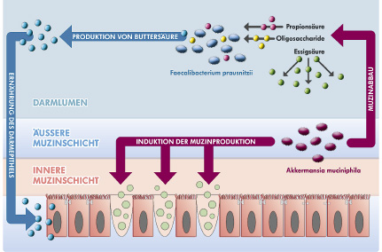Dr. med. Thomas Ellwanger, Herborn, MVZ Institut für Mikroökologie GmbH, Leitung Medizinische Wissenschaften In der richtigen Zusammensetzung fördern die Bakterien in unserem Darm die Gesundheit. Sie schließen unverdauliche Nahrungsbestandteile auf, versorgen uns mit Vitaminen und trainieren das Immunsystem. Gerät die bakterielle Gemeinschaft jedoch aus dem Gleichgewicht, kann das weit reichende Folgen haben. Allergien, chronisch-entzündliche Darmerkrankungen und Krebs werden zum Beispiel mit einer veränderten Darmflora in Verbindung gebracht. Die bakterielle Besiedlung des Menschen beginnt mit seiner Geburt. Und ebenso früh kann der Grundstein für eine ungünstig zusammengesetzte Darmflora gelegt werden. Wie zahlreiche Studien des letzten Jahrzehnts zur bakteriellen Besiedlung gezeigt haben, ist die Darmflora für den Menschen umso gesünder, je vielfältiger sie ist. Doch unser modernes Leben wirkt der bakteriellen Vielfalt entgegen. So unterbindet zum Beispiel eine Geburt per Kaiserschnitt den Kontakt des Neugeborenen zu den Bakterien des Geburtskanals und damit die Besiedlung mit gesundheitsfördernden Bakterien. Ältere Geschwister oder auch eine Bauernhofumgebung tragen zur bakteriellen Vielfalt bei – sie fehlen oft in einer modernen Gesellschaft. Bei Kaiserschnittgeburten, fehlenden Geschwistern und städtischer Umgebung steigt das Risiko der Kinder, an einer Allergie oder Asthma zu erkranken. Bakterielle Immunerziehung Verantwortlich dafür ist die fehlende Immunerziehung während einer empfindlichen Phase in den ersten Lebensmonaten. Denn zu diesem Zeitpunkt lernt das Immunsystem anhand der Darmflora, zwischen gefährlich und ungefährlich zu unterscheiden. Ist die bakterielle Vielfalt eingeschränkt, kann das Immunsystem weder eine ausreichende Toleranz gegenüber ungefährlichen Stoffen entwickeln, noch genügend Schlagkraft gegenüber Krankheitserregern ausbilden. Damit trägt eine ungünstig veränderte Darmflora zur Entstehung von Allergien, Autoimmunerkrankungen oder auch einem geschwächten Immunsystem bei. Bakterien für eine gesunde Darmschleimhaut Doch der Einfluss der Darmflora endet nicht mit dem ersten Lebensjahr. Die Darmflora unterstützt uns ein Leben lang. Mit der Stoffwechselleistung von 100 Billionen Bakterien schließt sie Nahrungsbestandteile für uns auf und stellt die Energieversorgung der Darmschleimhaut sicher. Denn die Hauptenergiequelle der Darmschleimhaut ist Buttersäure, die wir nicht in ausreichender Menge selbst bilden oder mit der Nahrung aufnehmen. Buttersäureproduzenten wie das Bakterium Faecalibacterium prausnitzii sind deshalb für die Bereitstellung der Buttersäure verantwortlich. Dafür arbeiten die Bakterien im Team. Den Ausgangsstoff für die Buttersäureproduktion liefert ein anderes Bakterium: Akkermansia muciniphila. A. muciniphila lebt in und von der Schleimschicht zwischen Darmschleimhaut und Darminhalt. Bisher stuften Wissenschaftler die schleimabbauenden Fähigkeiten von A. muciniphila als schädlich ein, doch inzwischen haben sie erkannt: der Abbau regt die Becherzellen an, neuen Schleim zu produzieren. Gleichzeitig nutzt F. prausnitzii die Abbauprodukte als Nährstoff und bildet daraus die dringend benötigte Buttersäure (Abb. 1). Das komplexe Zusammenspiel von A. muciniphila, F. prausnitzii und den Zellen der Darmschleimhaut verdeutlicht, wie stark die einzelnen Bestandteile des Ökosystems Darm ineinander verzahnt sind und welche Folgen Veränderungen in der Darmflora haben können.