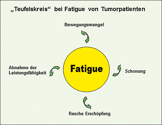 Körperliche Aktivitäten Die früher vertretene Empfehlung, sich bei Tumor Fatigue auszuruhen, hat sich als falsch erwiesen. Der Teufelskreis von Erschöpfung, Bewegungsmangel, verminderter Leistungsfähigkeit und Schonung sollte unterbrochen werden. Dabei ist es sinnvoll, mit körperlichem Training so früh wie möglich, schon am Beginn der Krebsbehandlung einzusetzen. Körperliche Aktivität hat eine Vielzahl von positiven Effekten wie verbesserte Herzfunktion, bessere Blutdruckregulation, Reduktion der Blutfette, Zunahme von Muskelmasse und Muskelenzymen, Steigerung des Atemminutenvolumens, Besserung von Immunreaktionen und Verminderung von Depressionen, Ängsten und Fatigue.
