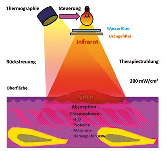 Abb.2.: Schema Thermographie gesteuerte wIRA-Hyperthermie. Temperaturmessung Zur Qualitätskontrolle ist eine Temperaturmessung eigentlich bei jeglicher Hyperthermieanwendung zu verlangen, auch wenn bisher keine Einigkeit darüber besteht, wie genau eine verabreichte Hyperthermiebehandlung bezüglich ihrer Temperatur zu werten ist, respektive welche Dosisdefinition wir verwenden sollen. Die aus in den Körper und den Tumor eingelegten Temperaturmesssonden erhaltenen Werte, die man ähnlich der Strahlentherapie in so genannte Temperaturisodosen umzurechnen versuchte, stellen leider nur eine Annäherung dar und erweisen sich teilweise als wenig zuverlässig. Erschwerend kommt hinzu, dass die Messdaten aus einem Kanal stammen, also nur von der Einstichstelle aus gesehen linear in der Tiefe Temperaturangaben liefern. Ob daneben kompensatorische Mechanismen wie z.B. verstärke Durchblutung mit folgender tieferer Temperatur und der Gefahr der Unterdosierung ablaufen oder umgekehrt wegen sehr schlechter Durchblutung oder Tumor bedingtem Gewebsuntergang zu hohe Temperaturen erreicht werden, wird nicht erfasst und kann daher die Temperaturanalyse verfälschen. Hier sind weitere Anstrengungen notwendig. Der „geographische“ Überblick, der mittels einer Thermographiekamera gewonnen wird, könnte theoretisch am besten gewährleisten, schlecht durchblutete Gebiete wie Narben, transplantierte Haut usw. zu erkennen und deren Übererwärmung mit Verbrennungsgefahr zu vermeiden. Die Thermographie gibt jedoch nur einen Eindruck wieder von Temperaturverteilung auf der Oberfläche und indirekt über Vorgänge in der Tiefe. Ob zusätzlich dann auch im Körper oder in einzelnen Tumorknoten eingelegte Temperaturmesssonden in jedem Fall durchzuführen sind, wird u.a. auch von der Zumutbarkeit, der Fragestellung und der Bereitschaft einer Patientin abhängen. Rein theoretisch könnte die für die Tiefenhyperthermie an einigen hoch spezialisierten Zentren benutzte MR-Untersuchung hier abhelfen und nicht invasiv Temperaturmessungen ermöglichen. Kernspintomographiegeräte sind aber nebst der Komplexität der Messungen sehr teuer und eine breite Anwendung dürfte kaum möglich, geschweige noch finanzierbar sein. Bestrahlungsmöglichkeiten Die Bestrahlungsmöglichkeiten nach vorausgegangener Bestrahlung sind beim Lokalrezidiv nach wie vor als begrenzt zu betrachten, auch wenn moderne konformierende Bestrahlungstechniken eine teilweise erneute hochdosierte Strahlentherapie erwägen lassen können. Es sind aber in der Literatur auch entsprechend schwere Nebenwirkungen nach Wiederbestrahlung beschrieben und müssen im Einzelfall mit der betroffenen Patientin abgewogen und besprochen werden. Es geht bei der Lokalbehandlung ja auch um Lebensqualität der betroffenen Frau und demzufolge sollte eine erneute Therapie diese nicht noch mehr einschränken, als es das nicht beherrschte Tumorwachstum bereits tut. So sollte jegliche lokale Therapie als so wenig belastend wie möglich geplant werden. Die Kombination mit Oberflächenhyperthermie ermöglicht, die Strahlendosis sowohl pro Einzelfraktion wie auch bei der Gesamtdosis unter die Toleranzgrenze der gesunden Strukturen zu drücken, ohne deswegen am Tumor den gewünschten Effekt preiszugeben. Ergebnisse – Eigene Erfahrungen Seit 1982 bestehen mit der Kombinationsbehandlung Hyperthermie-Radiotherapie gute Erfahrungen, wobei damals 1 – 2 Mikrowellen-Applikatoren mit 434 MHz eingesetzt worden sind. Begrenzend waren hier die effektive wirksame Behandlungsfeldgrösse der Hyperthermie, weshalb ab 2009 das eigens entwickelte Thermographie gesteuerte wIRA-System verwendet wird. Insgesamt sind mehr als 140 Patientinnen zu dieser Therapie aus verschiedenen Zentren zugewiesen worden und in beinahe 65% konnte ein sehr gutes Ansprechen respektive eine lokal praktisch komplette Zerstörung des Tumors festgestellt werden. Literatur Eine kürzlich erschienene systematische Übersicht und Meta-Analyse zeigt eindrücklich, was mit dieser Kombinationsmethode beim rezidivierenden Mammakarzinom erreicht werden kann: Aus 31 Mitteilungen gelang es, die Ergebnisse bei 627 Patientinnen, die in einer randomisierten Studie behandelt worden sind, zu analysieren. 1483 Patientinnen waren in so genannten single-arm-Studien eingeschlossen worden. Durchschnittlich erhielten beide Gruppen 7 Hyperthermiebehandlungen mit einer durchschnittlichen Zieltemperatur von 42,5°C. Die mittlere Bestrahlungsdosis betrug 38.2 Gy (26 – 60 Gy). Meistens war die Hyperthermie nach der Bestrahlung appliziert worden. Bei den vergleichenden Untersuchungen konnte im Kombinationsarm eine komplette Rückbildung von 60,2% festgestellt werden, im Arm mit der alleinigen Bestrahlung hingegen nur in 38,1%. Bei den Studien, wo nur über die Kombinationstherapie ohne Vergleichsgruppe berichtet wurde, stellte sich in 63,4% eine komplette Rückbildung ein. Betrachtet man gesondert die 779 Patientinnen, die bereits eine Bestrahlung erhalten hatten und daher die Wiederbestrahlung nur beschränkt möglich war, so sind die Ergebnisse noch eindrücklicher: in 66,6% war eine komplette Rückbildung zu verzeichnen. Schwere Nebenwirkungen dieser Kombinationstherapie (sogenannte III/IV Toxizitäten) traten akut in 14,5% und spät in 5,2% auf. Es lässt sich allerdings nicht unterscheiden, was Hyperthermie oder Bestrahlung, zur schweren Nebenwirkung wie und wieviel beigetragen hat. Zusammengefasst kann man feststellen, dass die Kombination Hyperthermie- Bestrahlung beim rezidivierenden Mammakarzinom eine Erhöhung der Rückbildungsrate um 22% gegenüber der alleinigen Wiederbestrahlung erreicht. Diese Kombinationstherapie kann daher als eine wirksame und sichere Behandlungsart angesehen werden und sollte bei der interdisziplinären Besprechung an einem Tumorboard immer in solchen Fällen in Betracht gezogen werden.