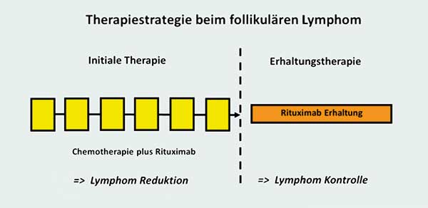 Patienten, die diese Kriterien nicht erfüllen, werden als Patienten mit niedriger Tumorlast bezeichnet und sind primär nicht behandlungsbedürftig. Patienten mit niedriger Tumorlast und ohne Symptome Aufgrund des indolenten Verlaufs follikulärer Lymphome und der begrenzten Therapiemöglichkeiten der 1990er-Jahre galt ein abwartendes Beobachten ohne therapeutische Intervention bei Patienten in fortgeschrittenen Stadien ohne klinische Symptome und mit niedriger Tumorlast als Vorgehen der Wahl. Dieser watch-and-wait-Ansatz konnte im Rahmen prospektiver, randomisierter Studien bestätigt werden. Diese zeigten eindeutig, dass ein zurückhaltendes Abwarten keinen therapeutischen Nachteil für die betroffenen Patienten darstellt (Brice P et al. 1997; Ardeshna KM et al. 2003). Berücksichtigt werden muss jedoch, dass auch diese Daten aus der Ära vor Rituximab stammen und daher einer Überprüfung im Hinblick auf die modernen therapeutischen Möglichkeiten bedürfen. Diese Überprüfung wurde von Ardeshna et al. initiiert (Ardeshna KM et al. 2014). Von dieser Gruppe wurden kürzlich Ergebnisse einer prospektiven, randomisierten Studie publiziert, in der die Autoren das konventionelle watch-and-wait-Vorgehen mit einer kurzzeitigen Gabe von Rituximab und einem dritten Therapiearm mit insgesamt 2-jähriger Rituximabgabe verglichen haben. Die ersten Ergebnisse dieser Studie zeigen eine signifikante Verlängerung der Zeit bis zum Fortschreiten der Erkrankung bei Patienten, die einem der beiden Rituximab-Arme zugeführt wurden. Inwieweit diese Ergebnisse auch mit einer Verlängerung der Überlebenszeit einhergehen, ist derzeit unklar. Unklar ist auch, ob der frühzeitige Einsatz der Antikörpertherapie die Effektivität einer nachfolgenden Behandlung beeinflusst und möglicherweise langfristig einen Nachteil für die Patienten darstellt. Die Empfehlung, am bisherigen watch-and-wait-Ansatz für asymptomatische Patienten mit niedriger Tumorlast festzuhalten, wird auch durch die Daten einer französischen Studie unterstützt, die ebenfalls keine negativen Effekte für Patienten ohne initiale Therapie zeigte (Solal-Celigny P et al. 2012). Angesichts der zurzeit raschen Weiterentwicklung therapeutischer Modalitäten und der zunehmenden Einblicke in die Biologie follikulärer Lymphome, sollte der watch-and-wait-Ansatz als Standard angesehen werden, bis klare Ergebnisse der laufenden Studien vorliegen und neue molekulare Marker eine bessere Definition von Patienten erlauben, die von einer frühzeitigen therapeutischen Intervention profitieren können. Patienten mit hoher Tumorlast und klinischen Symptomen Bei Patienten mit hoher Tumorlast und/oder klinischen Symptomen ist eine Behandlung erforderlich. Diese gliedert sich in zwei Abschnitte: I. die initiale Therapie, die zum Ziel hat, das Lymphom möglichst weit zurück zu drängen und eine sog. Remission zu erreichen und II. die sog. Erhaltungstherapie, die darauf ausgerichtet ist, nach initialer Therapie noch verbleibende Lymphomzellen weiter zu reduzieren oder zumindest zu kontrollieren und damit einen Rückfall der Erkrankung zu vermeiden. Initiale Therapie: Für die initiale Behandlung hat sich die Kombination von Rituximab mit einer Chemotherapie als Standard etabliert (Hiddemann W & Cheson BD 2014). Vier große prospektive, randomisierte Studien konnten eindrucksvoll zeigen, dass dieser Ansatz nicht nur zu einer wesentlichen Steigerung der Remissionsrate, sondern auch zu einer signifikanten Verlängerung des progressionsfreien und insbesondere auch des Gesamtüberlebens führt (Hiddemann W et al. 2005; Marcus R et al. 2008; Herold M et al. 2007; Salles G et al. 2008). Ob eines der in diesen Studien angewendeten chemotherapeutischen Regime einen Vorteil gegenüber anderen hat, bleibt umstritten. Während R CVP (Rituximab plus Cyclophosphamid, Vincristin und Prednisolon) dem R CHOP-Regime (Rituximab plus Cyclophosphamid, Hydroxydaunomycin = Doxorubicin, Vincristin, Prednisolon) unterlegen zu sein scheint (Morschhauser F et al. 2011), erwies sich Rituximab-Bendamustin gegenüber R CHOP von Vorteil im Sinne einer höheren Remissionsrate und eines längeren progressionsfreien Überlebens, ohne allerdings einen Unterschied im Gesamtüberleben zu zeigen (Rummel MJ et al. 2013). In einer vor kurzem abgeschlossenen Studie mit dem neuen Antikörper Obinutuzumab, der ebenfalls entweder mit CHOP, CVP oder Bendamustin kombiniert wurde, war demgegenüber eine höhere Rate infektionsbedingter Todesfälle unter Bendamustin zu beobachten (Marcus R et al. 2017). Unabhängig von diesen Überlegungen stellt die Immunchemotherapie in der Kombination von Rituximab plus Chemotherapie mit Remissionsraten von über 90 % und einem medianen progressionsfreien Überleben von mehr als 7 – 8 Jahren den aktuellen therapeutischen Standard in der Initialbehandlung follikulärer Lymphome dar (Abb. 3).