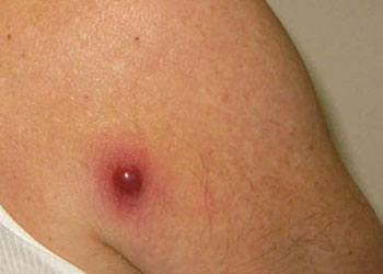 Abb. 2: Hautmetastasen können beim metastasierten malignen Melanom in Form von schwarz pigmentierten Knoten (Abb. links) oder als rötliche Knoten auftreten (Abb. rechts). Für die Behandlung des metastasierten malignen Melanoms bieten heute die nachfolgend dargestellten medikamentösen Therapien den optimalen Standard. Das Zellwachstum abschalten: Zielgerichtete Therapie durch Kinaseinhibitoren B-RAF ist ein Protein, das in den Zellen des Körpers für das normale Zellwachstum aktiviert wird. Beim malignen Melanom führt eine Mutation des B-RAF-Proteins dazu, dass das Signal zum Zellwachstum angeschaltet bleibt und somit zu unkontrolliertem Tumorwachstum führt. Eine B-RAF-Mutation ist beim malignen Melanom in ca. 40% bis 60% der Fälle nachweisbar [1,2]. Die Mutationsanalyse wird am Gewebe des Primärtumors bzw. des Tumormaterials der Metastasen gemäß der S3-Leitlinie bereits ab Stadium IIIB durchgeführt [3]. So wird bei diesen Hochrisikopatienten im Falle einer Fernmetastasierung bzw. bei nicht operabler Tumorsituation ein unmittelbarer Therapiebeginn möglich. Es ist durchaus empfehlenswert, auch mehrfach Mutationstestungen im Therapieverlauf bei neuaufgetretenen Metastasen durchzuführen, um die Therapiesituation möglichst aktuell beurteilen zu können. Liegt eine Mutation des Proteins vor, spricht man von einem B-RAF-positiven malignen Melanom und eine zielgerichtete Therapie mit einem sogenannten B-RAF-Inhibitor ist möglich. Im Jahr 2012 wurde in Deutschland als erstes der B-RAF-Inhibitor Vemurafenib zugelassen. In einer Phase III-Studie wurden fernmetastasierten und inoperablen Melanompatienten (Stadium IV und IIIC) Vemurafenib in einer Dosierung von 960 mg p.o. (Tabletteneinnahme) zweimal täglich verabreicht. Im Vergleich zur Chemotherapie [4] zeigte sich hierbei eine signifikante Verbesserung der Überlebensraten. Als zweiter B-RAF-Inhibitor wurde im Folgejahr Dabrafenib in einer Dosis von 150 mg p.o. zweimal täglich zugelassen. In der entsprechenden Phase III-Studie mit Dabrafenib im Vergleich zur Chemotherapie zeigten sich vergleichbare Ergebnisse [5]. Das objektive Ansprechen lag bei 50% versus 6%. Bemerkenswert ist, dass auch Melanompatienten mit hoher Tumorlast von der Behandlung mit einem B-RAF-Inhibitor profitieren. Das Nebenwirkungsspektrum beider Medikamente ist ähnlich, unterscheidet sich dennoch in einigen Aspekten. Unter Therapie mit Vemurafenib muss vermehrt mit Photosensitivität (erhöhte Lichtempfindlichkeit, Neigung zu Sonnenbränden) gerechnet werden und bei Anwendung von Dabrafenib kann es zum Auftreten von Fieber kommen. Unter beiden Medikamenten können Gelenkschmerzen, Hautausschläge, Müdigkeit, Übelkeit, Juckreiz und gehäuft Keratoakanthome (gutartige Hauttumore) auftreten. Engmaschige Kontrollen der gesamten Haut durch den Hautfacharzt sind daher empfehlenswert. Um eine weitere Verbesserung des Ansprechens zu bewirken, wird der jeweilige BRAF-Inhibitor mittlerweile standartmäßig mit einem sogenannten MEK-Inhibitor als Kombinationstherapie verabreicht. Wenn die Tumorzelle die Hemmung über BRAF umgeht, kann das Zellwachstum weiterhin blockiert werden, durch die Hemmung des MEK-Proteins weiter unterhalb im gleichen Signalweg. Eine Kombination beider Medikamente bietet also die optimale Wirkung. Manchmal wird die Dauer des Ansprechens jedoch trotzdem durch die Ausbildung von Resistenzmechanismen begrenzt. Bei geringer Tumorlast, geringer Dynamik und geringen klinischen Beschwerden sollte daher zunächst eine Immuntherapie erwogen werden. Das körpereigene Immunsystem aktivieren: Immuntherapien durch Antikörper induzierte „Checkpoint-Blockaden“ Unabhängig vom Mutationsstatus besteht beim metastasierten malignen Melanom die Option einer Immuntherapie. Die hier zum Einsatz kommende Art von Medikamenten verstärkt die bereits vorhanden Fähigkeit des Immunsystems zur Krebsbekämpfung durch die Gabe von monoklonalen Antikörpern. Auch hier ein kurzer Rückblick auf die Entwicklung der letzten Jahre: Zunächst erfolgte 2011 erstmalig die Zulassung von Ipilimumab. Die Infusionen wurden in einer Dosierung von 2 mg/kg/Körpergewicht im Abstand von jeweils drei Wochen durchgeführt. Bei guter Verträglichkeit wurde nach der vierten Gabe die Therapie abgeschlossen und die weitere Wirkung abgewartet. Das Funktionsprinzip des CTLA-4 Antikörpers Ipilimumab besteht in der Aktivierung des Immunsystems. Das CTLA-4 (zytotoxische T-Lymphozyten-assoziierte Antigen 4) ist ein hemmender Rezeptor, der die Immunzellen herunter reguliert und damit als natürliche „Bremse“ des Immunsystems fungiert. Durch die Blockade mittels des CTLA-4-Antikörpers wird das inaktivierende Signal verhindert und sozusagen die „Bremse des Immunsystems“ gelöst (Abb. 3).