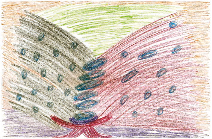 Die nachfolgend zweite Zeichnung stellt dar: „wenn alles wieder gut ist“. Beide Zeichnungen sind am 11. Juli entstanden. Wie schon erwähnt, sind diese Bilder mit der nicht-dominanten Hand gezeichnet worden. Das Unterbewusste kann sich so leichter, unverfälschter darstellen. Bildlich konkrete Darstellungen sind vorwiegend auf Ihren Symbolcharakter und auf strukturelle Aspekte hin zu untersuchen. Das zweite Bild „wenn alles wieder gut ist“ stellt einen Schmetterling dar, nachdem er sich der Raupenhaut entledigt hat und in ganzer Schönheit strahlt. Er füllt das ganze Bild aus. Angesichts der weit metastasierten Tumorsituation liegt der Gedanke nahe, dass hier das Bild gezeichnet ist, wenn sich eine Seele des Körpers entledigt hat und frei sich entfalten kann.