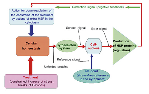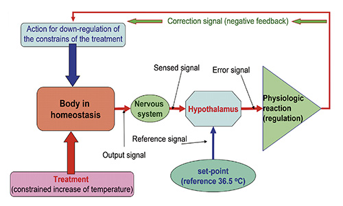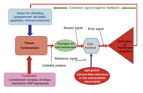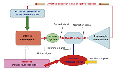 Figure 4. Oncothermia acts differently. The natural therapy helps the homeostatic control, consequently the physiology does not work against this action. The main task is to direct the physiology in the standard way, and act on such normal line. The positive feedback loops (the avalanche effects), which may destroy the normal homeostatic equilibrium, has to be stopped by the therapy. Let us see an example, the hyperthermia treatment. When the set-point in hypothalamus is normal for temperature regulation, the body controls the physiological actions (like sweating, subcutan capillary bloodflow, heart-rate, etc.) and tries to suppress the effect of the external heating. However, when the set-point is adjusted, the complete physiological reaction-set helps the temperature increase in natural way, (see Figure 5.) [19]. a.) Body in homeostasis, Nervous system, set-point, (reference 36.5 oC), Hypothalamus, Physiologic reaction (regulation), Treatment, (constrained increase of temperature), Correction signal (negative feedback), Output signal, Sensed signal, Reference signal, Error signal, Action for down-regulation of, the constrains of the treatment. b.) Body in homeostasis, Nervous system, set-point, (reference 38 oC), Hypothalamus, Treatment, (natural, slight increase of temperature), Output signal, Sensed signal, Reference signal, Correction signal, Action for up-regulation of the treatment-effect, modified set-point, Physiologic amplification, Amplified correction signal (positive feedback).
