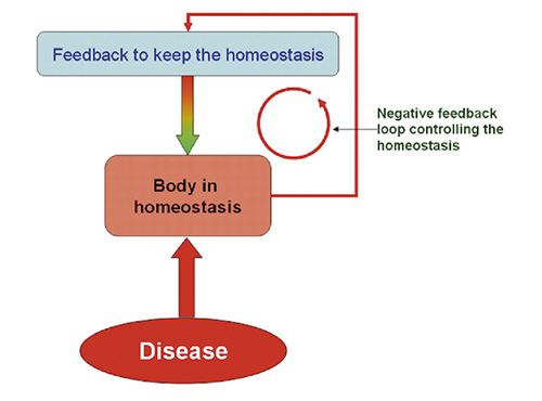 Feedback to keep the homeostasis, Body in homeostasis, Disease, Enhanced negative, feedback loop, controlling the homeostasis. Figure 2. The disease breaks the homeostasis, so the physiology tries to compensate and correct the damage (Feedback to keep the homeostasis Body in homeostasis, Disease, Constrained treatment, Extreme feedback loop tries controlling the homeostasis. Action for downregulation of the constrains of the treatment).