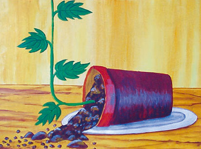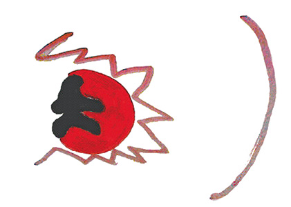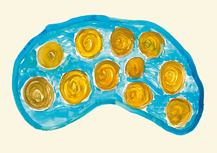 Abbildung 5: Imagination der gut durchbluteten und aktivierten Immunorgane einer Patientin mit Ovarialkarzinom Großer Wert wird darauf gelegt, dass die reale Situation des Immunsystems in die Arbeit realistisch einbezogen wird. Dabei spielt die autogene Steuerung der durchblutungsbedingten Aktivierung oder des Schutzes (bei Chemotherapie-Wirken) der Organe des Immunsystems eine große Rolle. Die zentrale Rolle des Thymus („Gehirn der Immunabwehr“) wird einbezogen. Nach wahrnehmend imaginativer Einstellung auf die Erfassung des Ist-Zustandes kann die Erarbeitung einer stabilen Situation der Immunorgane eine gute Stabilisierungshilfe für die Patienten sein. Nach der Aktivierung des Immunsystems erarbeitet die Patientin/der Patient den Einsatz der aktivierten Immunzellen zur Eliminierung der Krebszellen. Offensichtlich kann sich das System in der täglichen Arbeit der Patienten aktivieren und spezifizieren und dadurch immer wirksamer werden (Selbstorganisation).